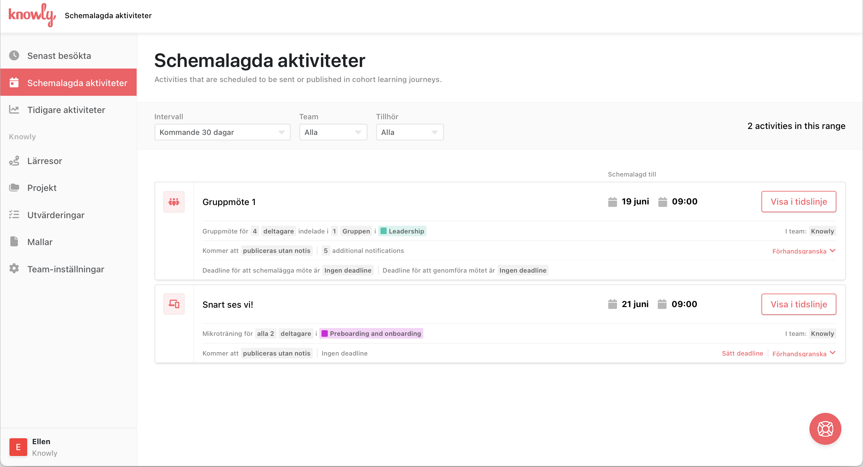 Du når schemalagda aktiviter från din startskärm i Knowly. För att få just den vyn du vill kan du välja intervall, team och vem lärresan ska tillhöra.