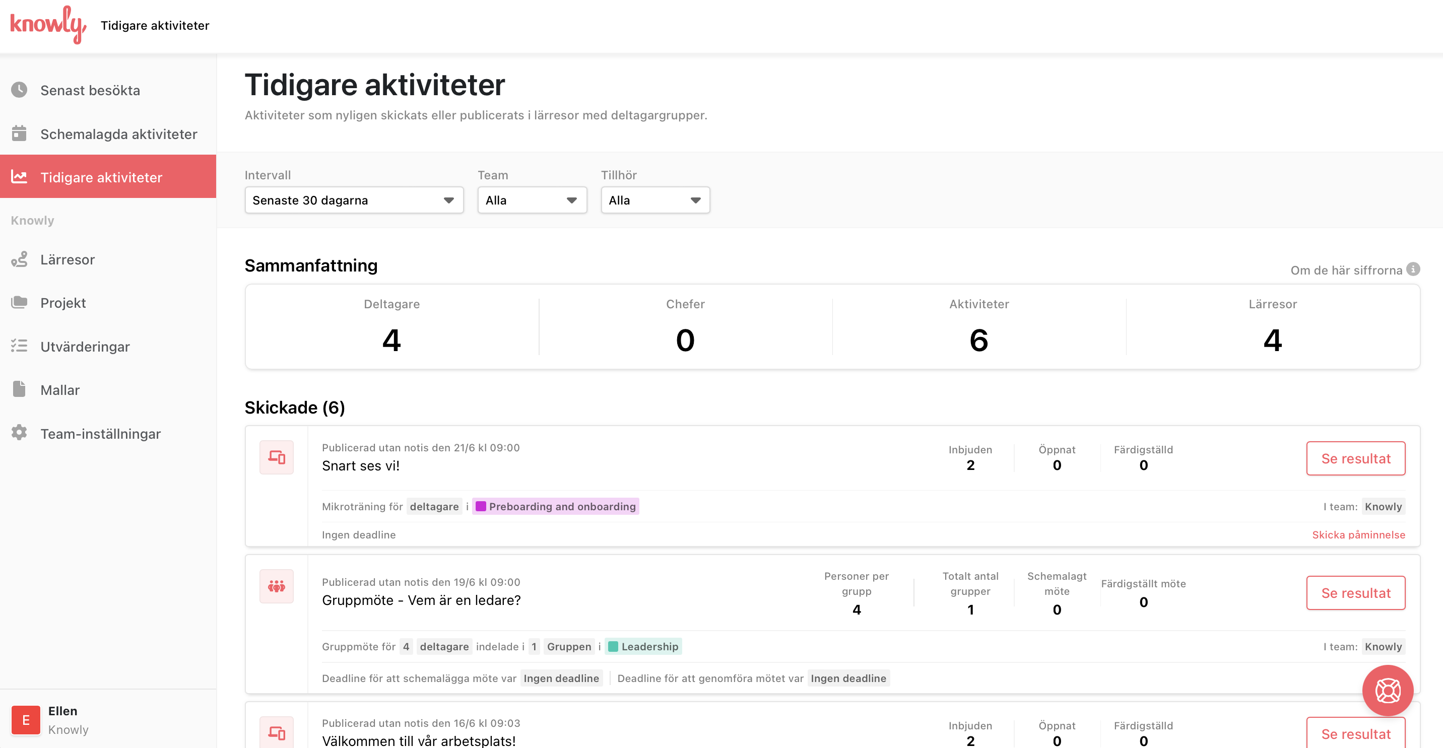 Du når tidigare aktiviter från din startskärm i Knowly. Det går att ställa in intervall, team och vem lärresan tillhör, så att sammanställningen ska bli i linje med vad du är intresserad av att se.