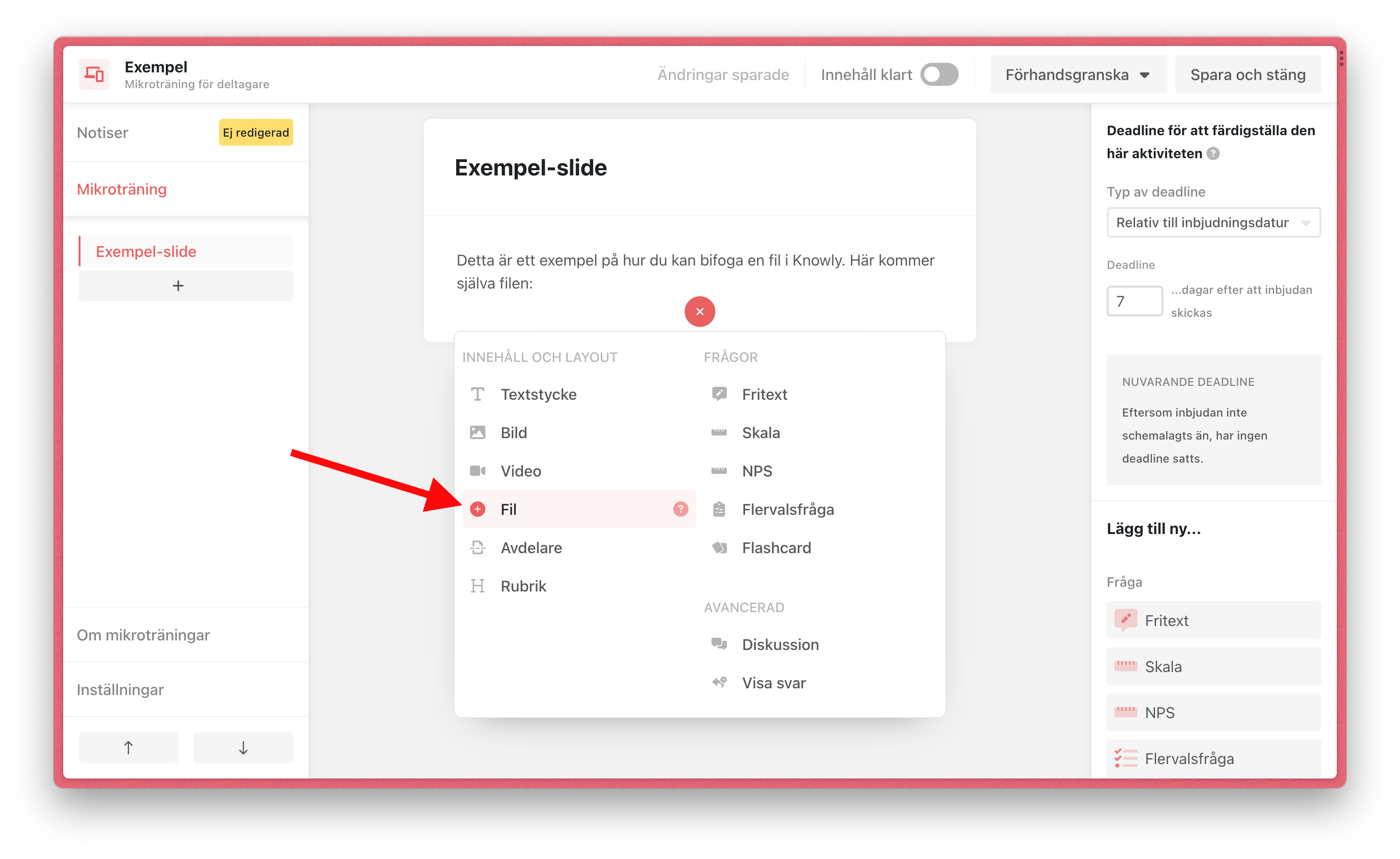 - Tryck på "Fil" från menyn där du lägger till innehåll i en mikroträning.