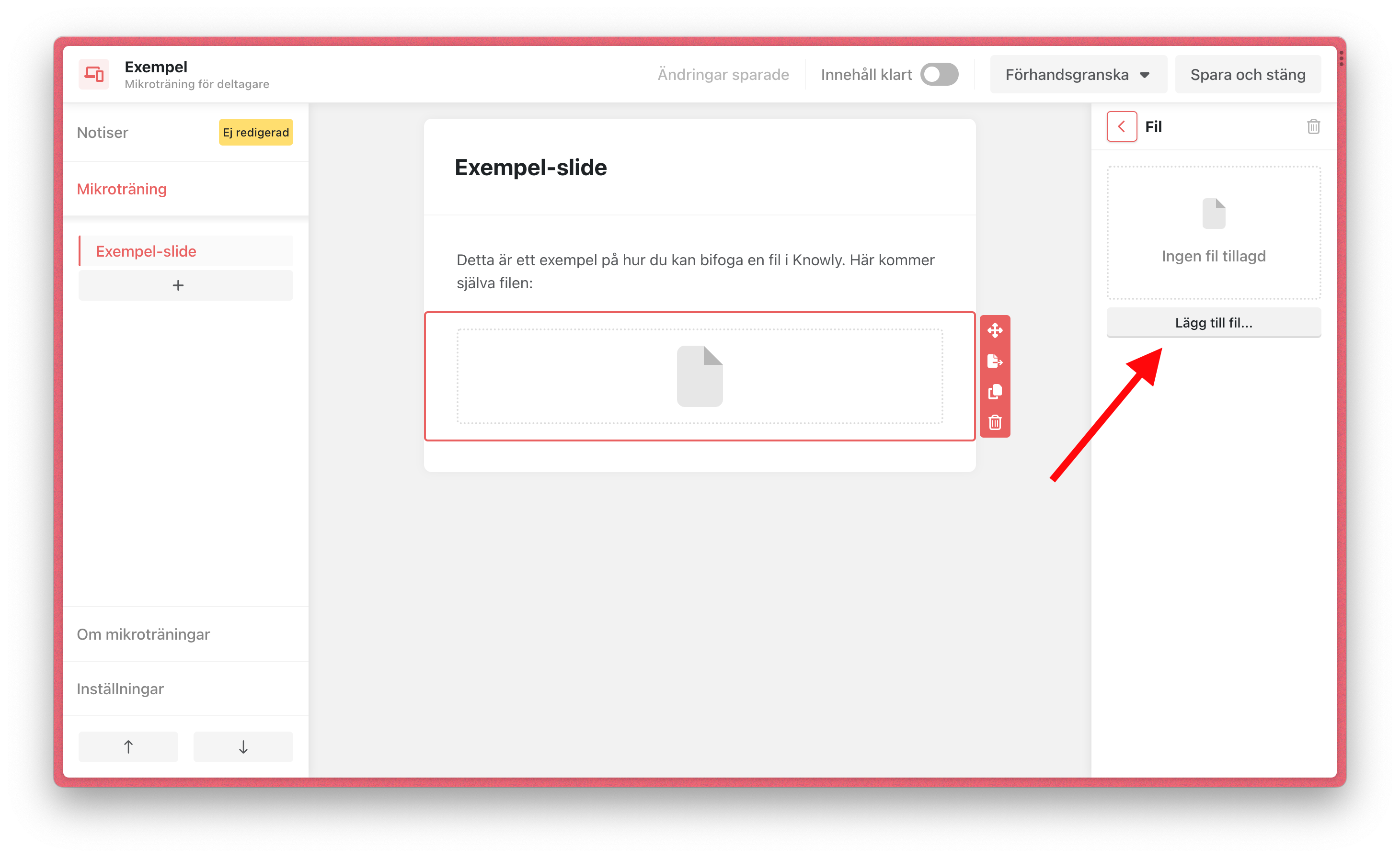 - Om din lärresa innehåller minst en mikroträning som ännu inte skickats är ett bra alternativ att lägga till filen i en slide där.