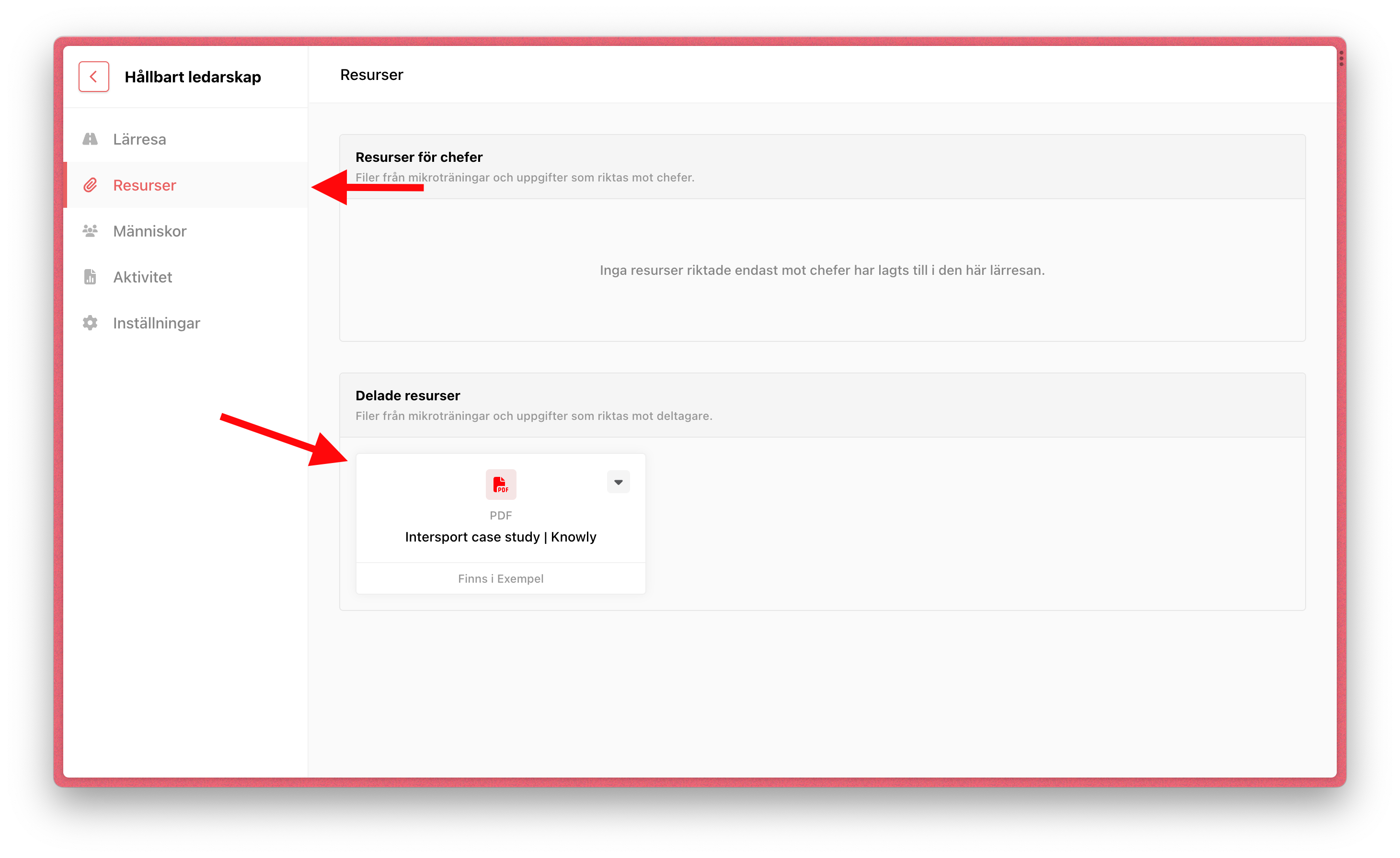 - Filer som laddats upp i mikroträningar finns tillgängliga under fliken Resurser.
