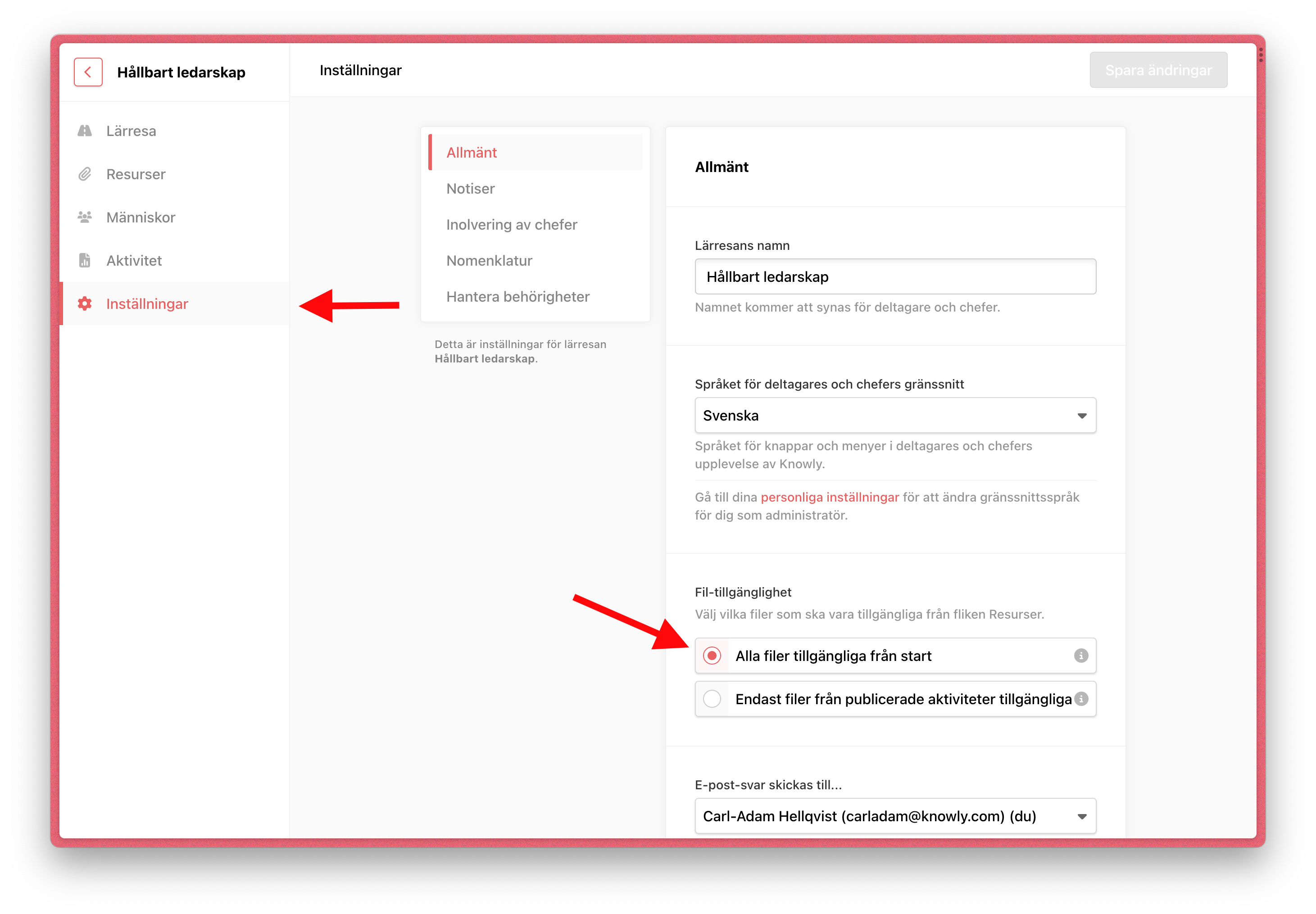 - För dig som har chefer som en del av din lärresa: Chefer ser alla filer som är tillgängliga för deltagare, men deltagare ser inte de filer som endast är tillgängliga för chefer.