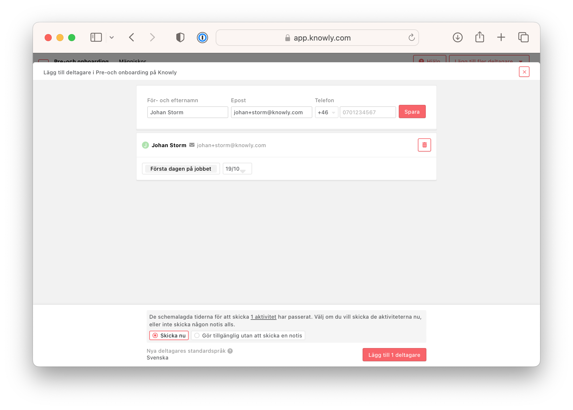 Om du lägger till en medarbetare vars startdatum är kortare inpå än det första utskicket är schemalagt så får du en fråga om du vill skicka det direkt eller göra tillgänglig utan att skicka notis. I bilden nedan ser du hur det ser ut.