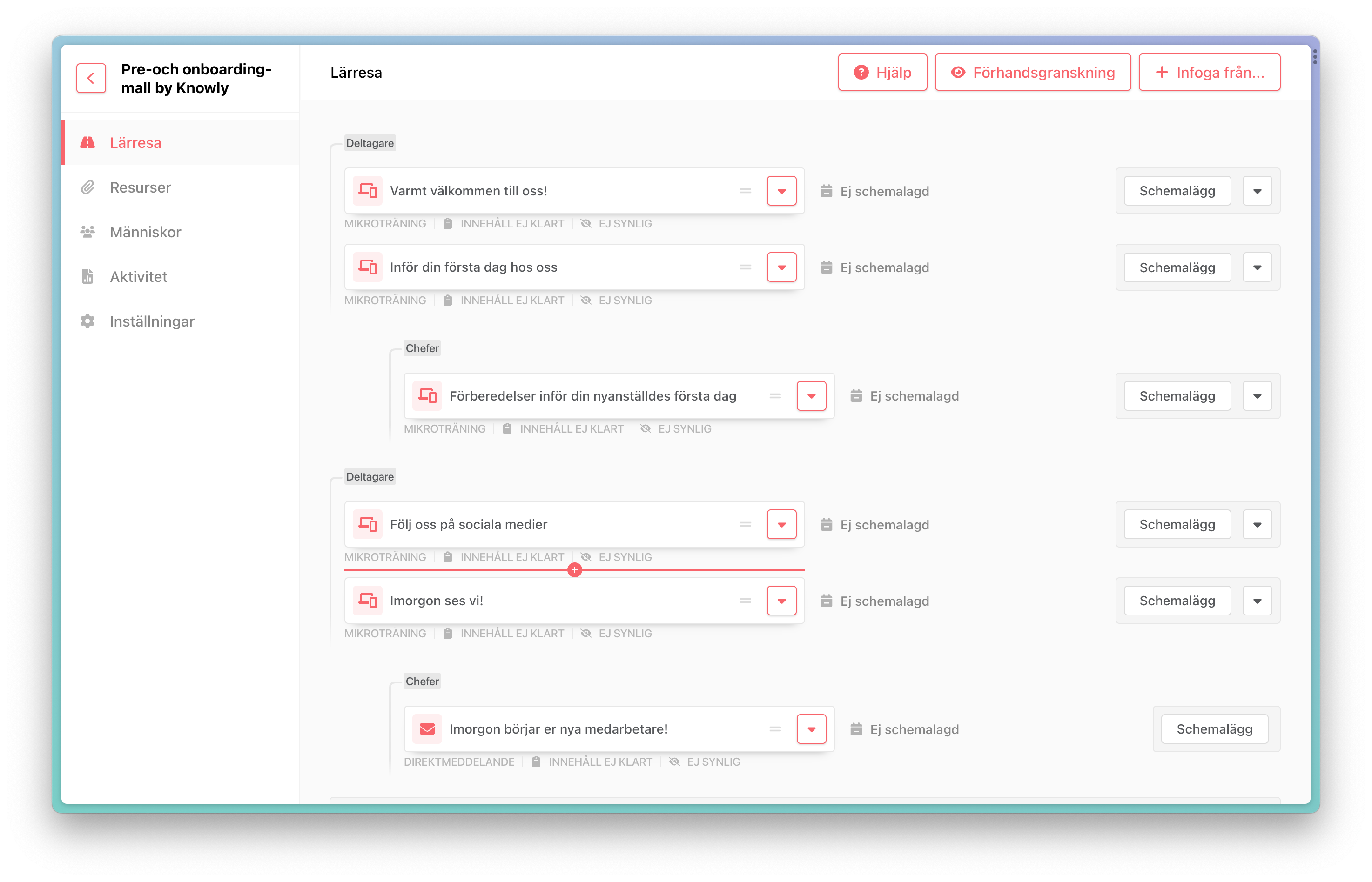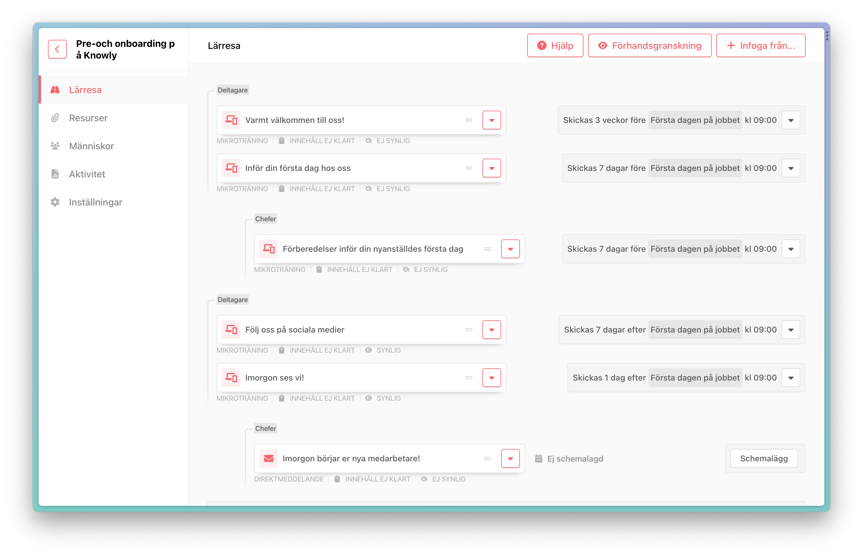 - Upplägget med standardiserade scheman gör att du kan skapa helt personliga scheman samtidigt som du enbart behöver registrera kontaktuppgifter och datum för ankarpunkten. I fallet med onboarding betyder det alltså att en ny medarbetare kan få en helt personlig lärresa utsträckt över tid även om du som administratör enbart behöver registrera kontaktuppgifter och startdatum.